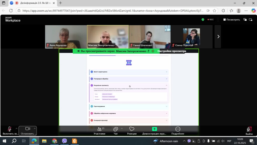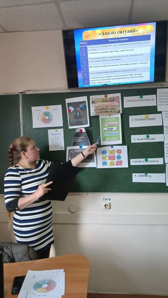 Студенти виконували інтерактивні вправи, як відрізнити факти, судження, репутацію, авторське право, плагіат. Визначали сутність понять «медіаграмотність», «маніпулювання», «фактчекінг», «інформаційна війна», «фейк», «джинса»; розглянули небезпечні впливи медіа, ознайомилися з ключовими поняттями, розповсюдженими видами маніпуляцій та пропаганди.